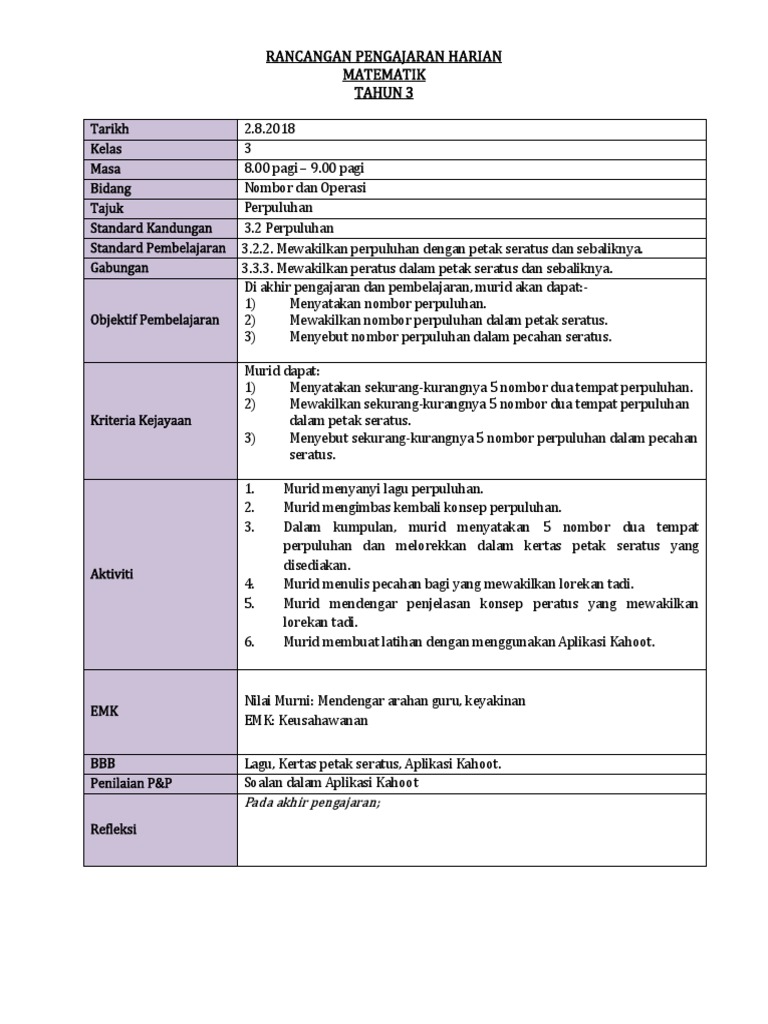Contoh Rph Matematik Tahun 3 Kssr Semakan Pdf